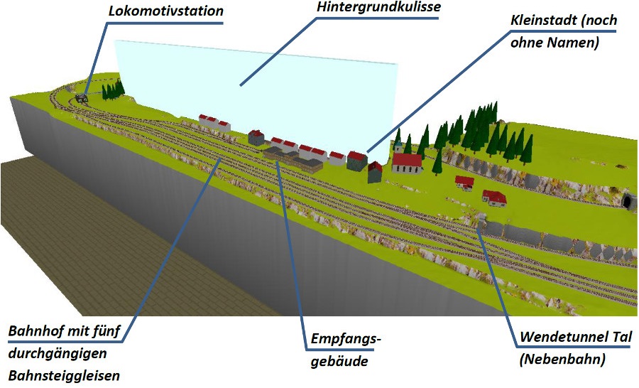der „Wandseite&rdquo unseres Anlagenraums angelegt wird. Durch diesen führen eine zweigleisige elektrifizierte Hauptstrecke